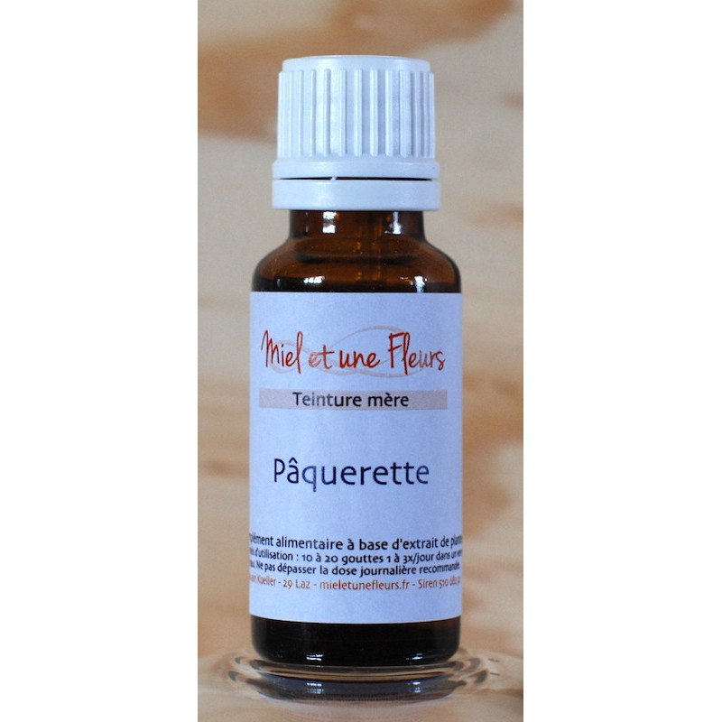 Macération hydro-alcoolique (teinture-mère) de Pâquerette (Bellis perennis) dans de l'alcool biodynamique.